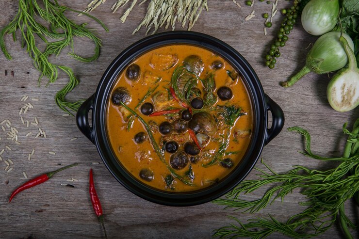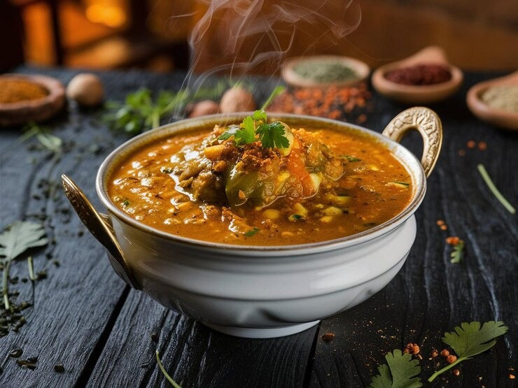 Vathal Kulambu is a deeply flavorful, tamarind-based curry known for its rich taste and aromatic spice blend.